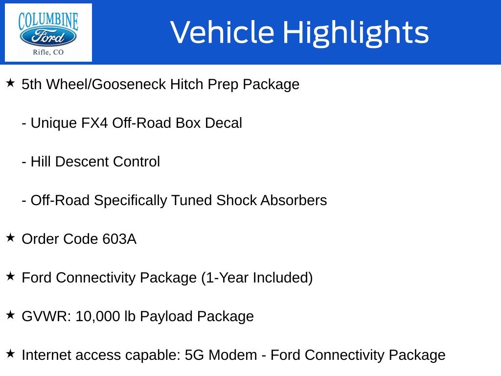 4WD, 5th Wheel/Gooseneck Hitch Prep Package, Ford Connectivity Package (1-Year Included), GVWR: 10,000 lb Payload Package, Hill Descent Control, Internet access capable: 5G Modem – Ford Connectivity Package, Off-Road Specifically Tuned Shock Absorbers, Order Code 603A, Unique FX4 Off-Road Box Decal.