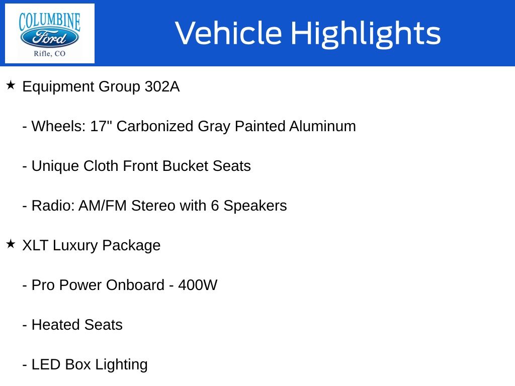 At Columbine Ford, we’re proud to be Western Colorado’s most trusted dealership and a multi-year recipient of Ford’s prestigious President’s Award for exceptional customer satisfaction. Our team is committed to honesty, transparency, and delivering a hassle-free buying experience on every visit. Whether you’re shopping New or pre-owned, you’ll find unbeatable service, western Colorado’s largest selection of vehicles, competitive pricing, and a dealership that truly cares. Visit us at 2828 Railroad Ave., Rifle, CO 81650 or call 970-625-1680. Experience the award-winning difference at Columbine Ford—where Colorado comes to drive. Price excludes taxes and fees. Price includes: $500 – Retail Customer Cash. Exp. 03/31/2026